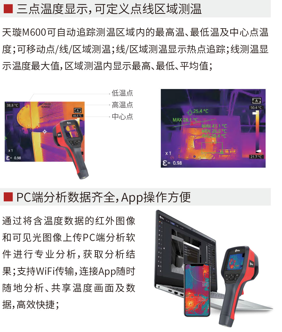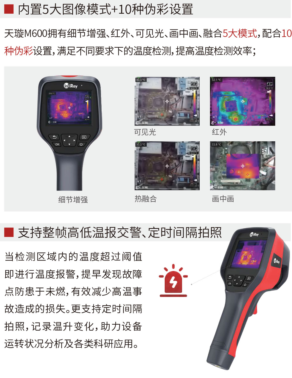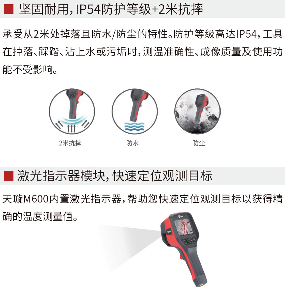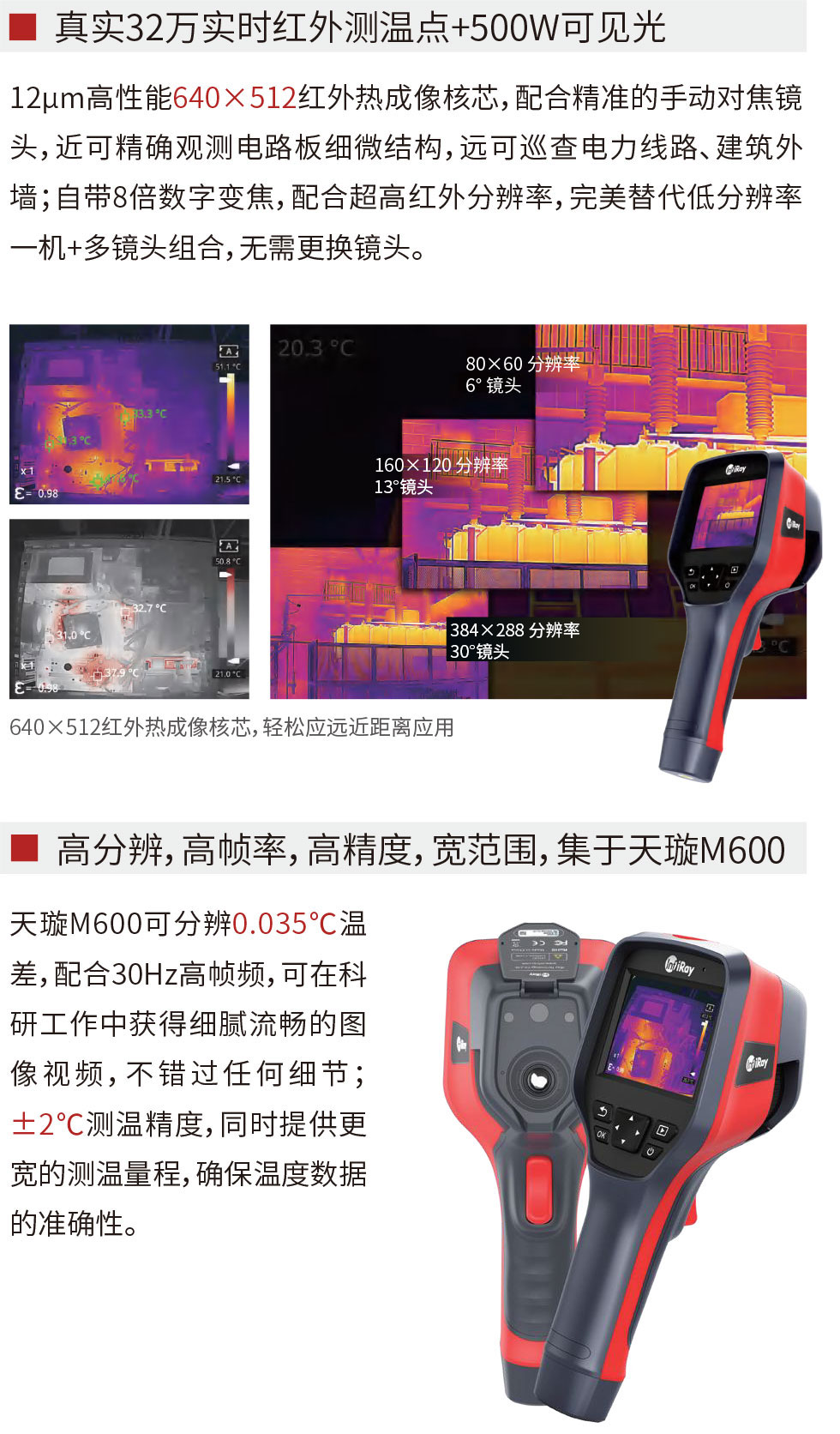 艾睿光電天璇M600手持紅外熱像儀是一款高分辨率手動對焦型熱成像測溫儀。內置艾睿光電自研12μm高性能640×512紅外熱成像核芯,搭配500W可見光相機,35mK熱靈敏度+30Hz高幀頻,精準的手動對焦功能,可節省對焦時間,提供滿足科研、分析工作要求的精確數據和清晰圖像。天璇M600紅外熱像儀擁有眾多出色特性,是科研、專業設備及房屋檢查工程師的得力助手。
