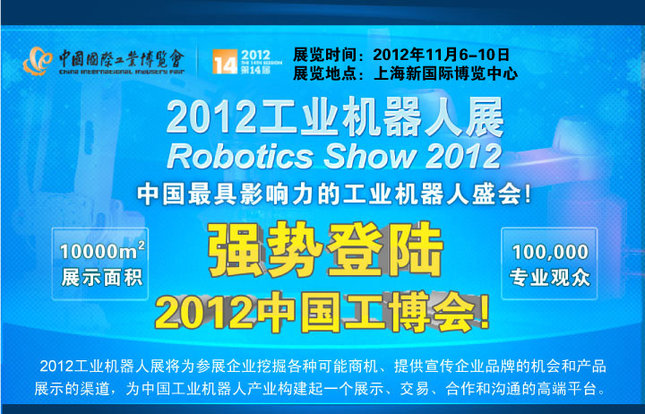 為了更好地服務(wù)于先進(jìn)裝備制造企業(yè),2012工業(yè)機(jī)器人展將首次強(qiáng)勢亮相第14屆中國國際工業(yè)博覽會,為工業(yè)機(jī)器人廠商和有采購需求的企業(yè)提供了一個(gè)專業(yè)、權(quán)威、高端的服務(wù)平臺。屆時(shí)預(yù)計(jì)有將近10萬的專業(yè)觀眾可以一次性目睹國內(nèi)外各知名機(jī)器人企業(yè)的風(fēng)采。2012年11月6-10日,上海新國際博覽中心W2館,最火熱的展館位置,位于IAS工業(yè)自動化展的核心區(qū)域,5000平方米展示規(guī)模,工業(yè)機(jī)器人將為您展開一場別開生面的"機(jī)器人盛會"。