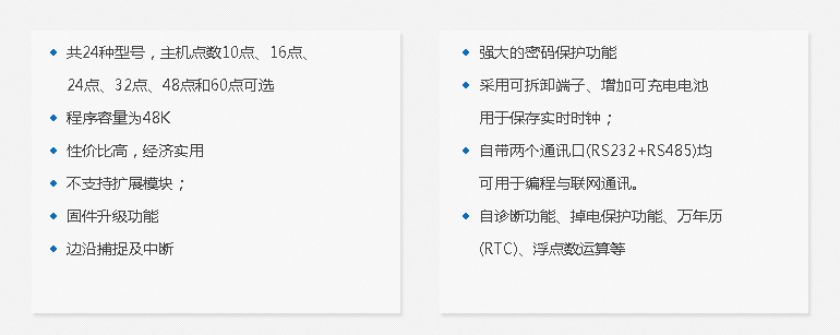 | C系列是海為最新研發(fā)的經(jīng)濟(jì)實惠、編程簡單、性能可靠、功能強(qiáng)大的可編程控制器,內(nèi)核全新升級,采用ARM結(jié)構(gòu),運(yùn)行速度提升10倍以上;新增自整定PID功能,整個自整定過程時間不超過1.5分鐘,強(qiáng)大的通訊聯(lián)網(wǎng)功能(支持多種通訊協(xié)議、組網(wǎng)靈活、通訊高效可靠、通訊指令帶Out輸出、PLC作為從機(jī)不需要寫任何通訊程序 ),控制點數(shù)、程序容量、內(nèi)存元件數(shù)量等大幅度增加,提高了產(chǎn)品的性能和技術(shù)指標(biāo),價格卻非常實惠,是一款非常值得期待的性價比極高的新品。 |